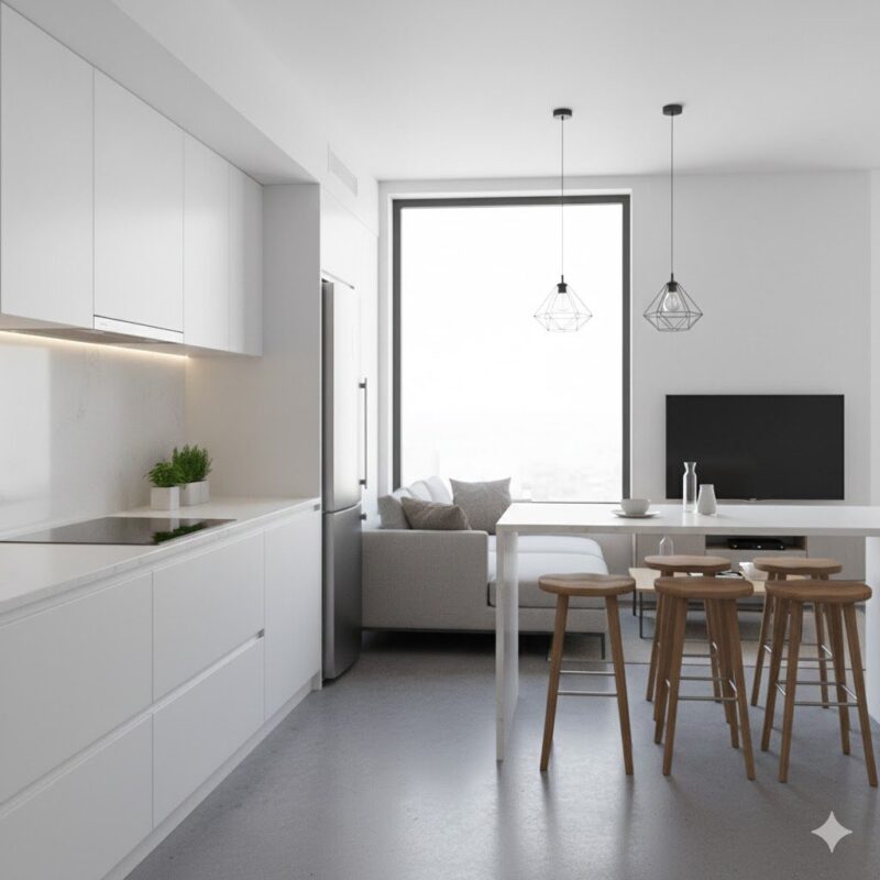 A cozinha em conceito aberto tornou-se a solução padrão para os apartamentos urbanos. Ao eliminar as barreiras físicas, ganhamos amplitude, luz natural e uma dinâmica social muito mais rica. No entanto, o desafio é fazer com que a área de serviço e a cozinha não “atropelem” o conforto da sala de estar.