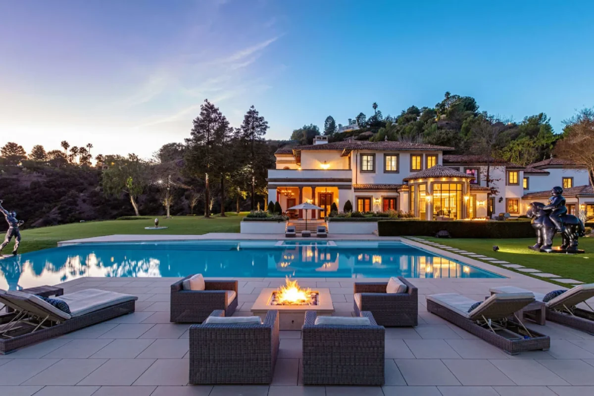 Esta propriedade de US$ 88 milhões possui quatro piscinas, spa, campo de basquete e garagem para 15 carros, representando o luxo extremo dos astros. -