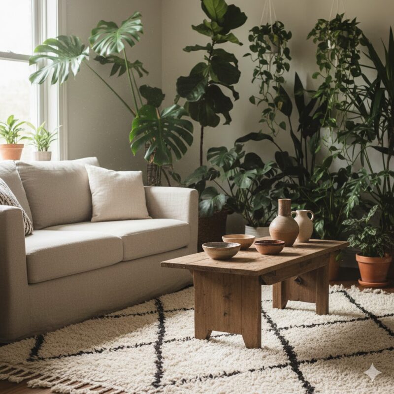 Dica de Especialista: Em salas pequenas, utilize a sobreposição de tapetes (um neutro grande por baixo e um étnico menor por cima) e abuse da biofilia. As plantas ajudam a suavizar a transição entre estilos diferentes.