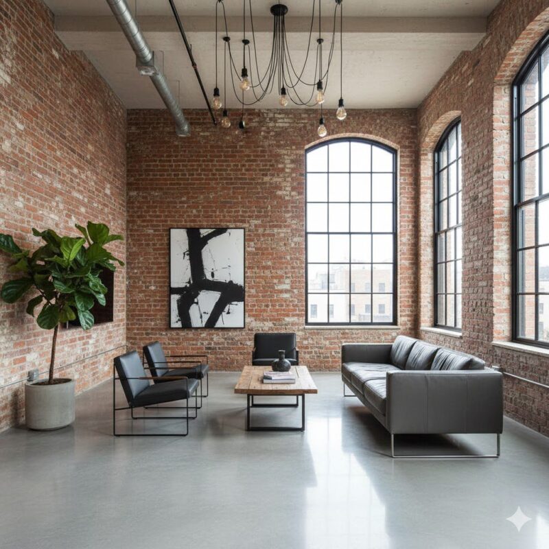 Materiais como tijolo, concreto e metal trazem textura e durabilidade, inspirados no brutalismo e industrialismo para criar ambientes robustos e contemporâneos.