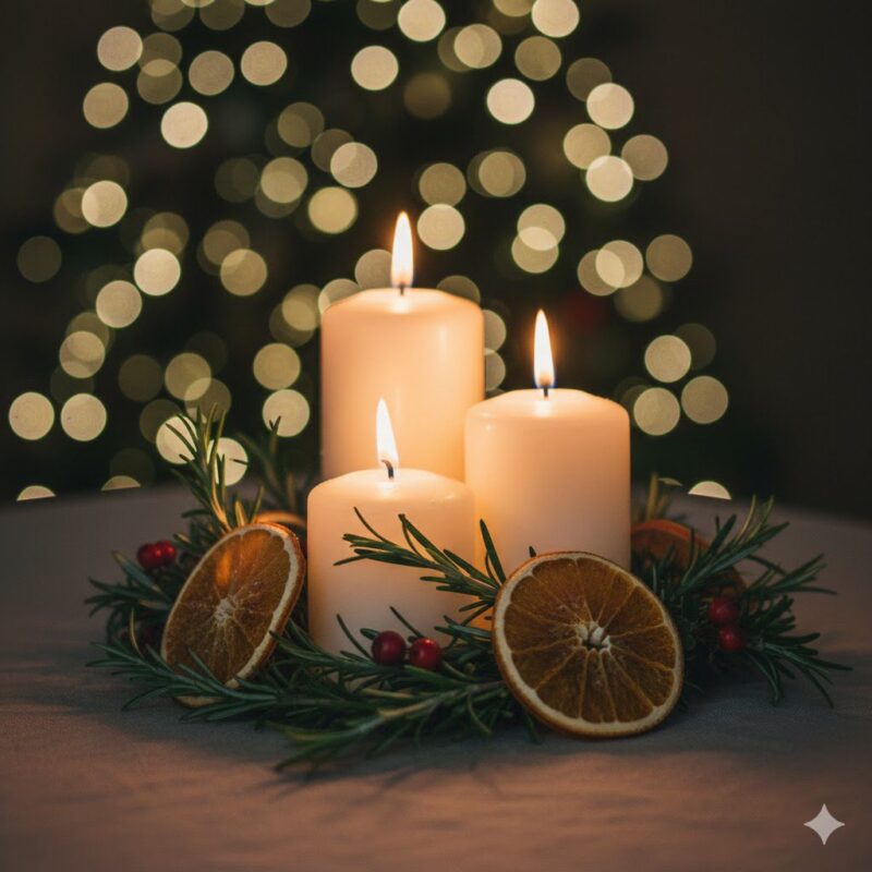 • Centro de Mesa Escalonado: Combine castiçais de alturas variadas com velas brancas ou vermelhas. Preencha a base com pinhas, folhagens e fatias de laranja seca para um aroma sutil e visual rústico.