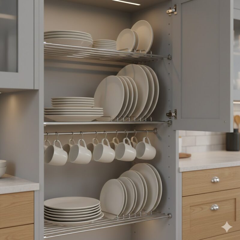 - Prateleiras Empilháveis: Permitem criar “andares” dentro do nicho, separando pratos rasos de pratos de sobremesa sem precisar tirar uma pilha inteira para alcançar o fundo.