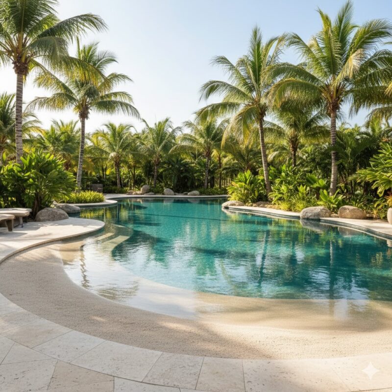Para o efeito de “praia particular” ser completo, o paisagismo ao redor é fundamental. Em 2026, arquitetos estão integrando rochas naturais, cascatas e vegetação tropical (como Coqueiros, Ravenalas e Bromélias) diretamente na borda da piscina. A iluminação em LED subaquática em tons de branco quente completa o cenário para o uso noturno.
